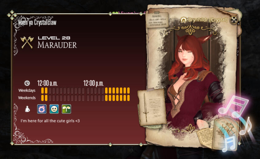 name: vixen'ya crystalclaw [surname is an alias/"stage name"; she thought it sounded cooler sexier and more iconic than her actual surname]; you can call her vixen or vix for short, vixen'ya is too formal.pronouns: she/herage: you are not supposed to ask a lady that!!!!!! but she's a legal adult and you should not be carding her, she'll tell you that much.sexuality: lesbiancombat style: flashy, always rushing in. all eyes better be on her at all times or else. naturally, tank is her default role, but she considers herself a jack of all trades and as an adventurer wants to be familiar with everything.backstory: vix, an orphaned miqo'te child, lived on her own as an urchin before eventually joining a traveling circus in her adolescence. with her troupe, she honed her acrobatics and general performance skills, but in the aftermath of the calamity she made the decision to strike out on her own and try to make a name for herself as an adventurer instead, believing her natural charisma & physical ability would be enough to shape her up into a famous adventurer with the right training and opportunities. thus, she split off from the troupe and hitchhiked her way to limsa lominsa, joining the local adventurer's guild upon her arrival.